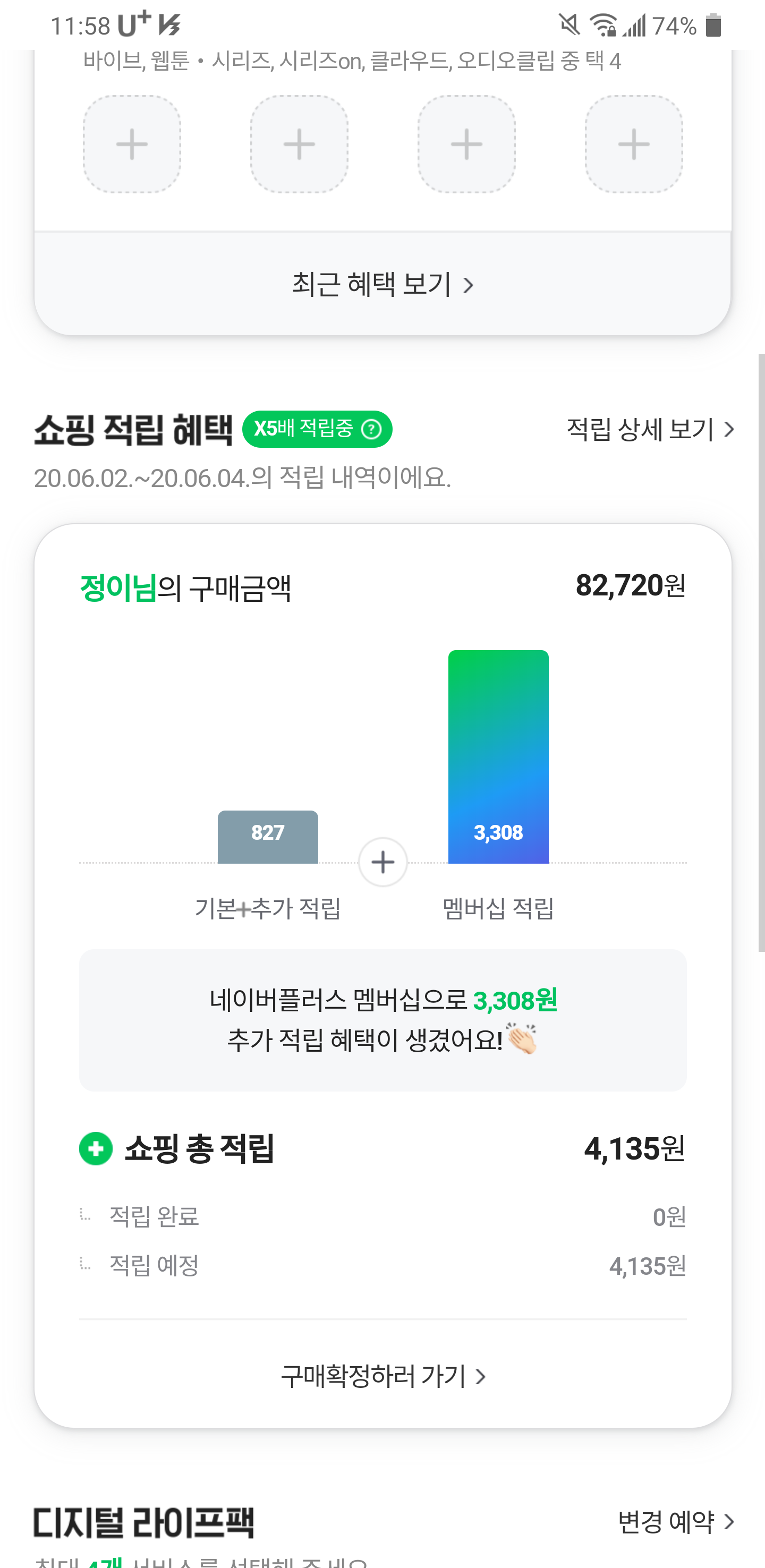 그래도 다 포인트로 돌아오고 있어서 네이버 혜택을 무료로 쓰고 있는거라고 생각하고 있다. 여튼 네이버 플러스로 5,000원 이상씩은 쌓이고 있으니..