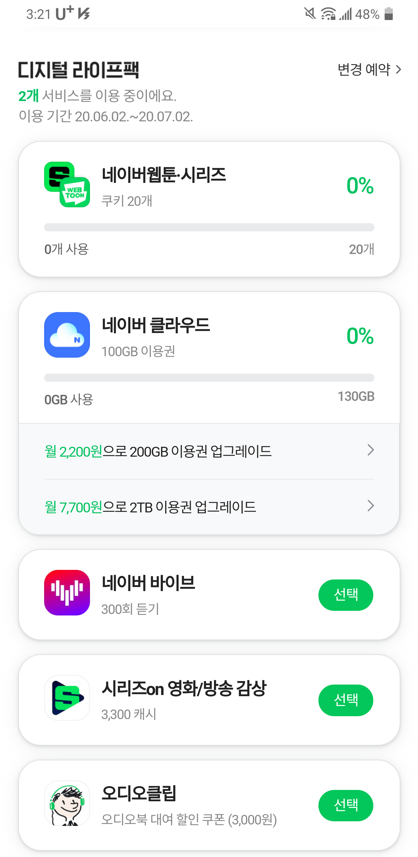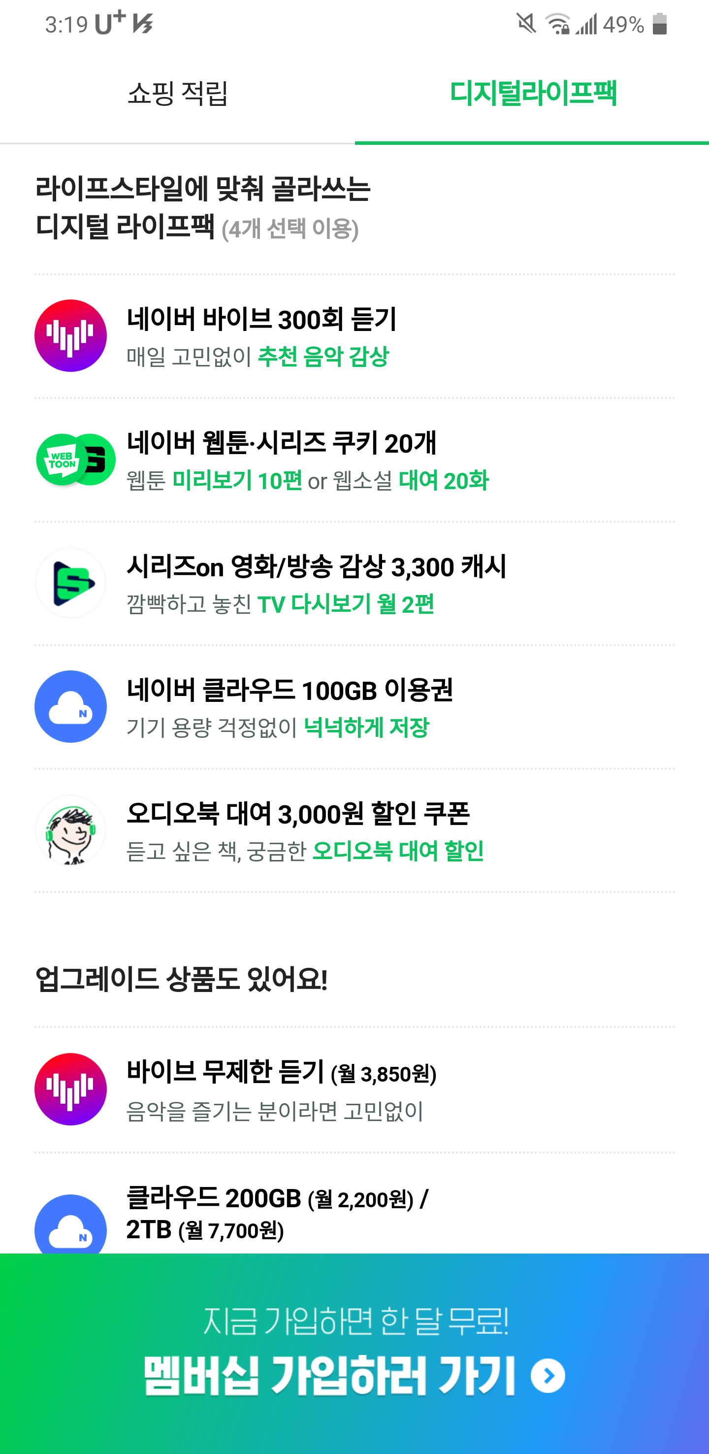 두번째는 디지털 라이프팩이라는건데 네이버 서비스를 추가로 이용하게 해준다는 것이다. 네이버입장에선 그냥 기본 있는 서비스 주는거니까 좋고, 가입자 입장에선 야튼 무료(또는 할인)로 뭔가 할 수 있으니까 좋다.