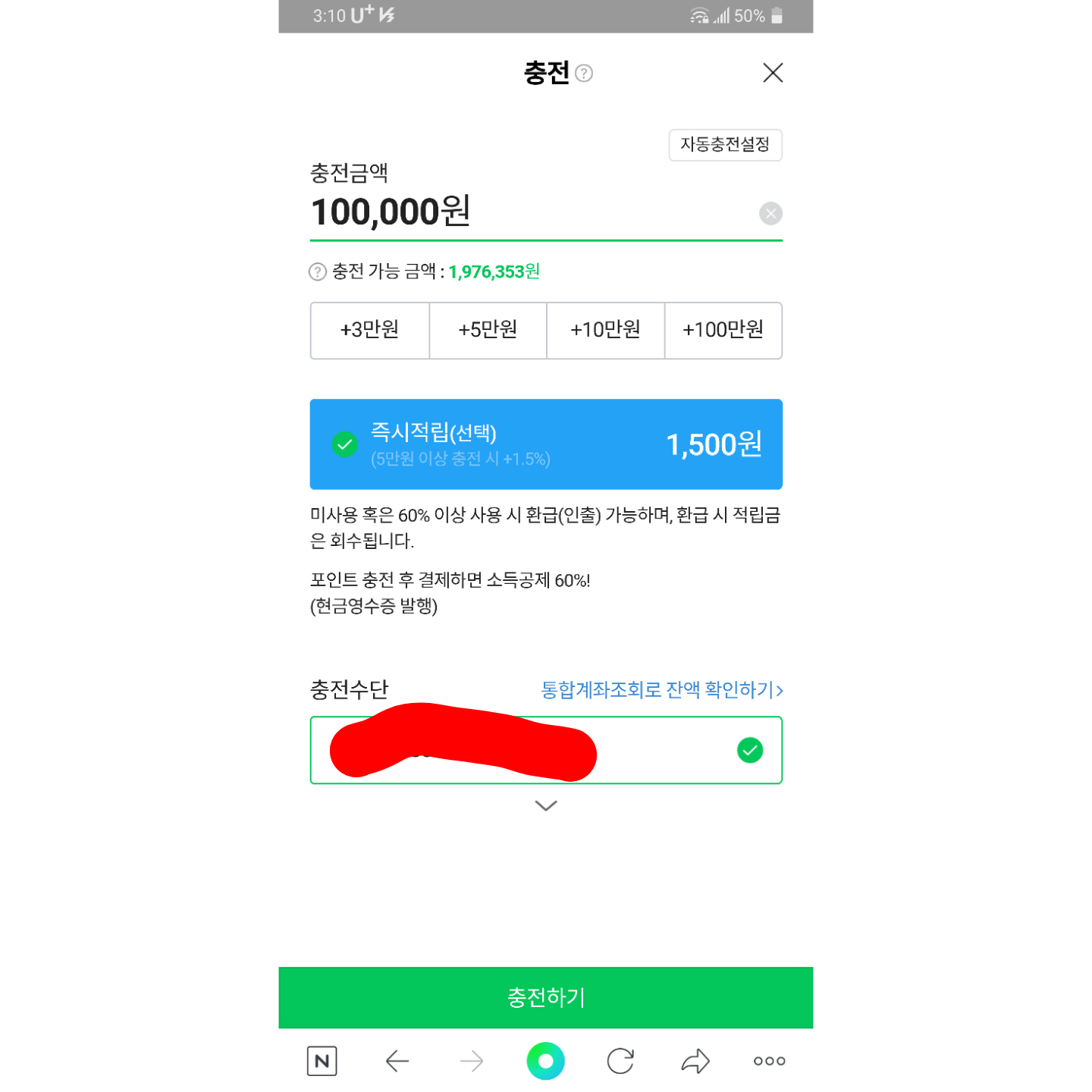 카드 실적의 문제가 아니라면 충전해서 현금영수증을 하면 1.5% 적립금이 쏠쏠